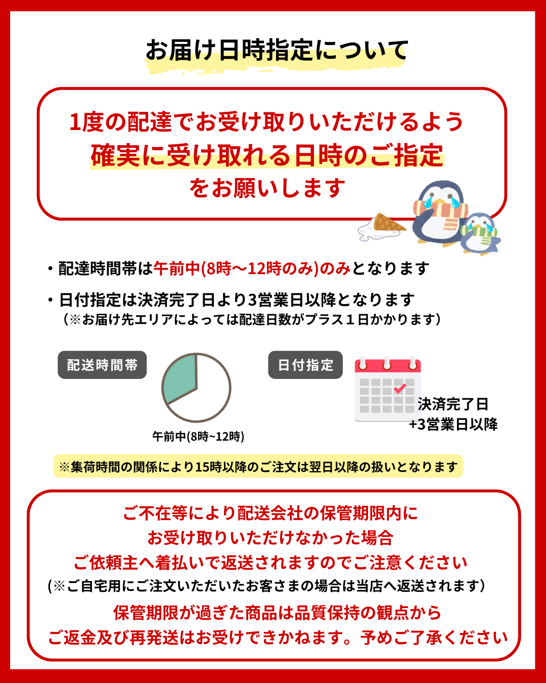 ※天候や大型連休、交通事情などによりお届け日時のご希望に添えない場合がございますので、予めご了承ください。