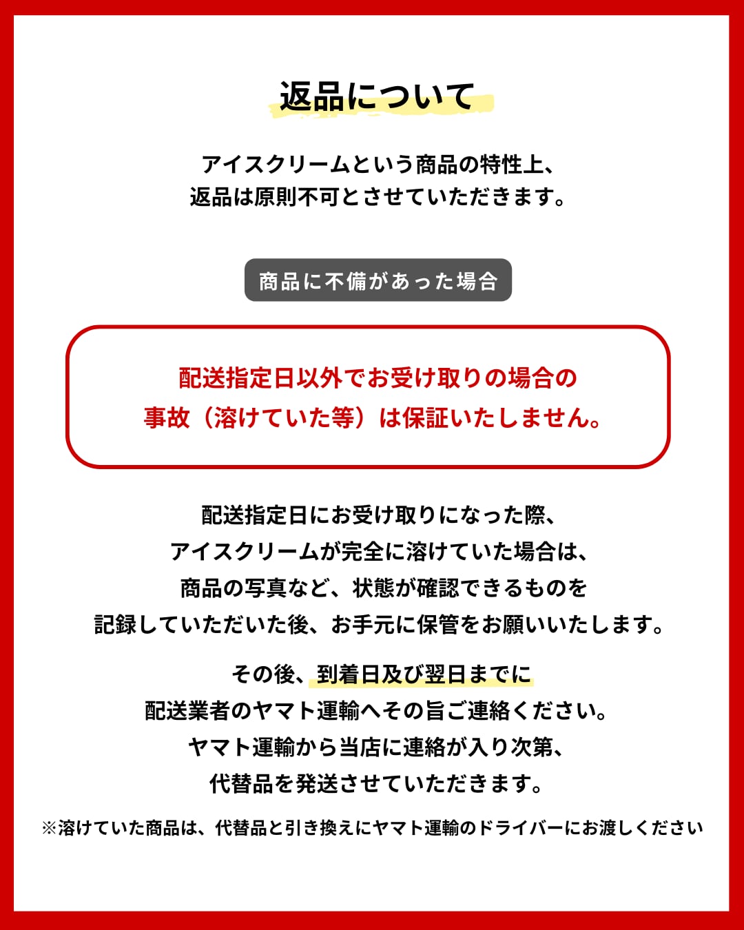 ・配送中にアイスが溶けないよう、ドライアイスを入れてのお届けとなります。商品到着時にドライアイスが残っている場合は、直接手を触れぬよう手袋などを着用して処分していただきますようお願いいたします。